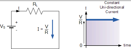 我们也知道直流电源在时间上不会改变它们的值,它们是在连续稳态方向上流动的恒定值。换句话说,DC 始终保持相同的值,并且恒定的单向 DC 电源永远不会改变或变为负值,除非其物理反转连接。以下示出简单 DC 或直流电路的示例。