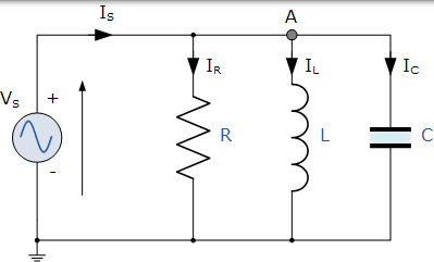 在上述并联 RLC 电路中,我们可以看到电源电压 VS 对所有三个元件都是通用的,而电源电流 IS 则由三部分组成。流过电阻器的电流,IR,电流流过电感器,IL 和通过电容器的电流,IC。