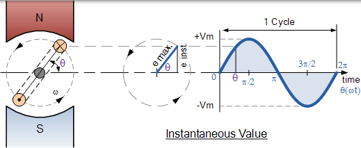 在任何时刻在线圈中感应的 EMF 取决于线圈切割磁极之间的磁通线的速率或速度,这取决于发电装置的旋转角度 θ。由于 AC 波形不断改变其值或幅度,因此任何时刻的波形将具有与其下一个时刻不同的值。