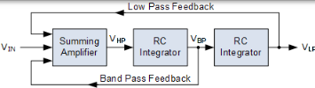 在恒定输入电压下,求和放大器输出的 VIN 产生高通响应,该响应也成为第一个 RC 积分器的输入。该积分器的输出产生带通响应,该响应成为第二个 RC 积分器的输入,在其输出端产生低通响应。结果,可以找到关于输入电压的每个单独输出的单独传递函数。