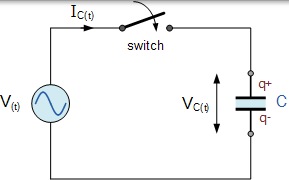 當交流正弦電壓施加到 AC 電容器的極板時,電容器首先在一個方向上充電,然後在相反方向上以與 AC 電源電壓相同的速率改變極性。電容器兩端的電壓瞬時變化與以下事實相反:將電荷沉積(或釋放)到板上需要一定的時間,並且由 V = Q / C 給出。考慮下面的電路。