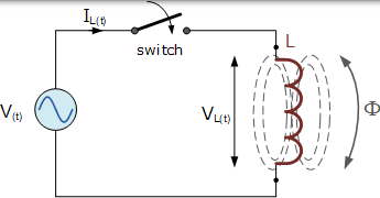 此電路由一個 L 亨的純電感的,橫跨在以下表示式給出的正弦電壓上連線: V(t) = VmaxsinωT。當開關閉合時,該正弦電壓將導致電流流動並從零上升到其最大值。電流的這種上升或變化將線上圈內引起磁場,這反過來將抵抗或限制電流的這種變化。