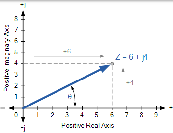 在矩形形式中,複數可以由被稱為複數或** s 平面的**二維平面上的點來表示。因此,例如,Z = 6 + j4表示的點,其座標在水平實軸上是6,在垂直虛軸上是4,如圖所示。