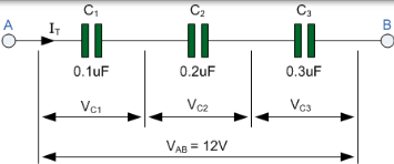 對於串聯電容器,流過電容器的充電電流 iC 對於所有電容器都是相同的,因為它只有一條路徑可供使用。
