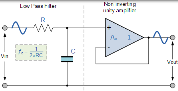 該一階低通有源濾波器僅由無源 RC 濾波器級組成,為非反相運算放大器的輸入提供低頻路徑。放大器配置為電壓跟隨器(緩衝器),其 DC 增益為 1,Av = +1 或單位增益,而不是之前的無源 RC 濾波器,其 DC 增益小於 1。