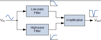通常,通過將低通濾波器(LPF)與高通濾波器(HPF)串聯組合來構造帶通濾波器。如圖所示,通過將“低通”和“高通”濾波器部分組合在一起形成“並聯”型別來建立帶阻濾波器。