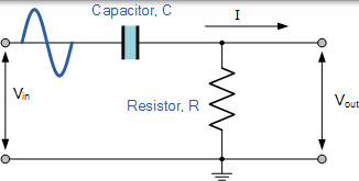 在這種電路中,電容器的電抗在低頻時非常高,因此電容器的作用類似於開路,並且在 VIN 處阻止任何輸入訊號,直到達到截止頻率點 fC。在該截止頻率點以上,電容器的電抗已經充分降低,現在更像是短路,允許所有輸入訊號直接傳遞到輸出,如下面濾波器響應曲線所示。