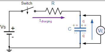 下圖顯示了一個電容器 C 與一個電阻 R 串聯形成一個 RC 充電電路,通過機械開關連線在直流電池電源( Vs)上。當開關閉合時,電容器將逐漸通過電阻器充電,直到其兩端的電壓達到電池的電源電壓。電容器充電的方式也如下所示。